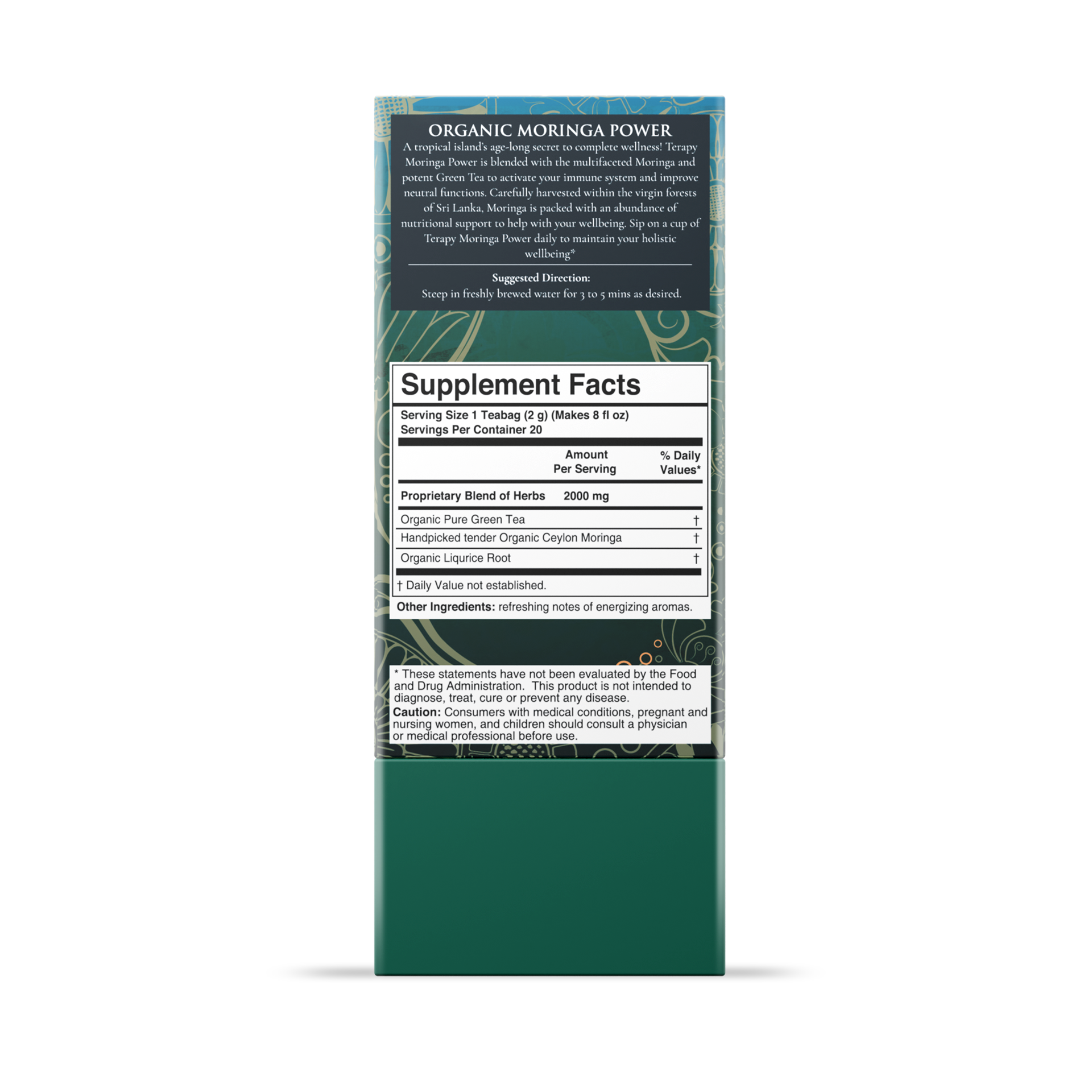 Our Moringa Power Tea features moringa, lemongrass, and Pure Ceylon green tea, crafted to deliver an energizing, nutrient-dense boost.