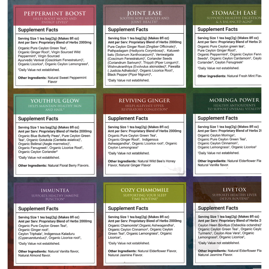 Indulge in the perfect blend of wellness and luxury with the Terapy Ceylon Gift Box, an exquisite collection of 9 Ayurvedic herbal teas, each offering a unique experience of relaxation and rejuvenation. This premium gift set includes 5 individually wrapped tea bags of each variety, ensuring freshness and convenience. Made with 100% natural ingredients, these handcrafted teas are based on the ancient principles of Ayurveda, designed to nurture both body and mind. Whether you're treating yourself or gifting someone special, this beautifully packaged set is the ideal way to spread joy and wellness this holiday season. Give the gift of serenity and health with the Therapy Ceylon Gift Box—a luxurious, thoughtful present for tea lovers and wellness enthusiasts alike.